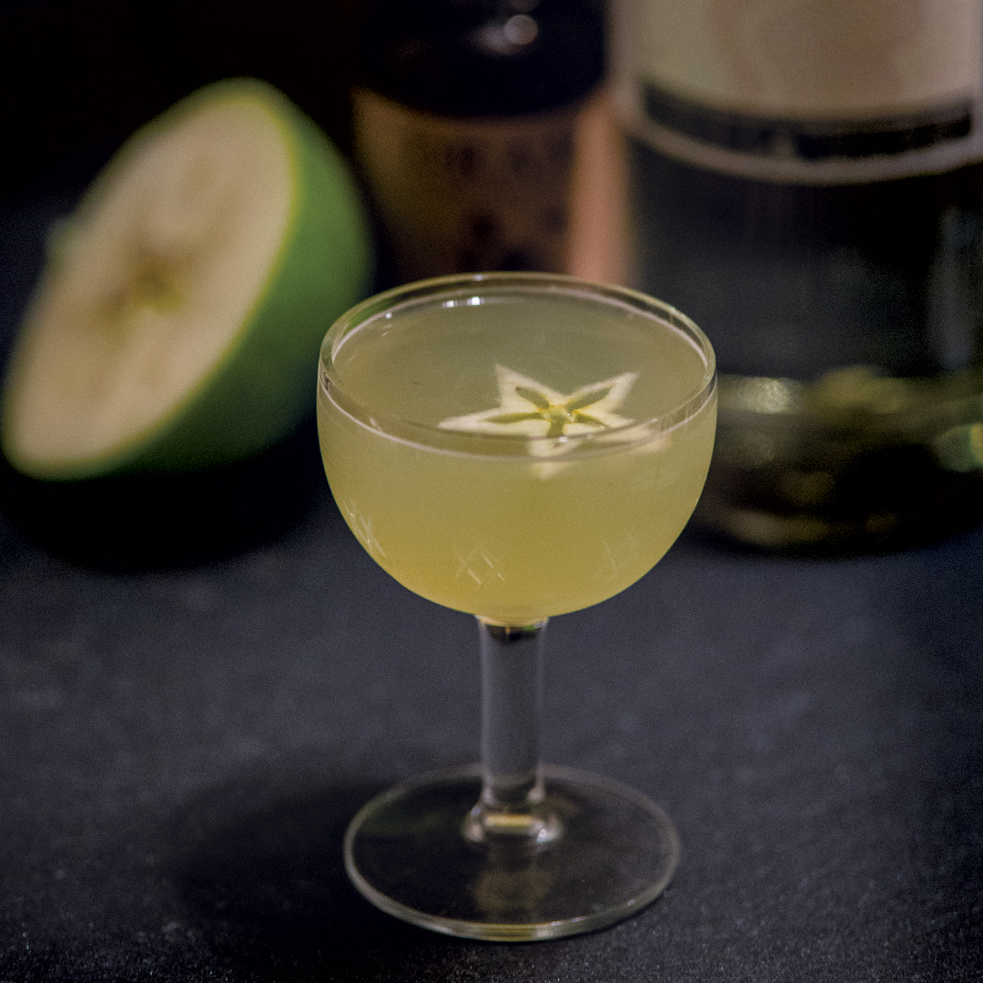 *Muddle apple and agave. Add remaining ingredients. Shake with ice and fine strain into a mini cocktail glass. Garnish with a star cutout of green apple core.